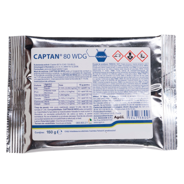 Fungicidul de contact Captan 80 WDG contine 80% captan sub forma de granule dispersabile in apa, fine, omogene, fara tendinta de sfaramare, de culoare beige, cu miros slab caracteristic. Fungicidul Captan 80 WDG, este un fungicid de referinta in controlul rapanului in cultura de mar. Produsul se recomanda spre a fi utilizat in combaterea unui spectru larg de boli din culturile de castraveti, ceapa, mar, prun, tomate, vita de vie. Folosind acest produs in timpul perioadei de vegetatie prin stropiri efectuate la avertizare, va asigurati culturi libere de boli, datorita actiunii rapide pe care o are fungicidul asupra spectrului de combatere indicat. Astfel, plantele tratate vor putea beneficia de o dezvoltare normala, in care productiile nu vor fi afectate.